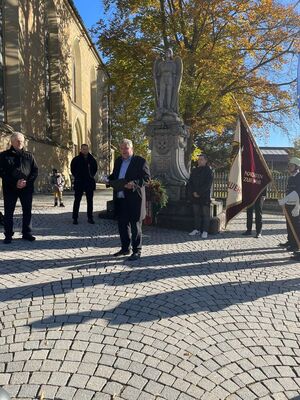 In Vollmaringen fand am Sonntag, den 13. November 2021 die alljährliche Gedenkveranstaltung zum Volkstrauertag statt. An der St. Georgskirche trafen sich zahlreiche Vollmaringer zum Gedenken am Mahnmal für die Gefallenen der beiden Weltkriege. Ortsvorsteher Daniel Steinrode gedachte in seiner Ansprache den Millionen Toten der beiden Weltkriege. Dieses Jahr stand die Gedenkveranstaltung ganz im Zeichen des Ukrainekrieges. Steinrode ging in seiner Rede auf den von Putin zu verantwortenden Überfall Russlands auf die Ukraine ein und das damit verbunden Leid für die Menschen. Neben den gefallenen Soldaten erinnerte er vor allem auch an die vielen zivilen Opfer insbesondere an das Schicksal der Vertriebenen und der Flüchtlinge.