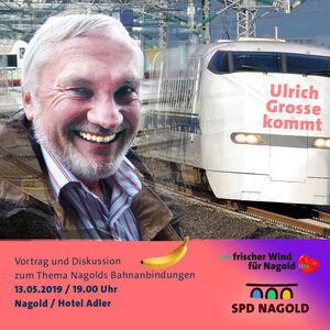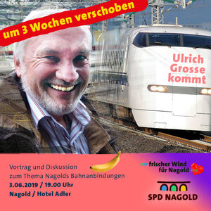 Auf Grund einer persönlichen Verhinderung des Referenten Ulrich Grosse wird die Diskussionsveranstaltung zur Bahnanbindung Nagolds an Stuttgart um 3 Wochen auf den 03.06.2019 um 19.00 Uhr verschoben.