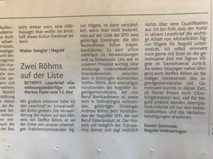 Mit großem Interesse habe ich den Leserbrief „Gewöhnungsbedürftig“ von Markus Heim im Schwarzwälder Boten gelesen. Seine Verwunderung auf den Hinweis von Steffen Röhm, er sei der Enkel von unserer ehemaligen Fraktionsvorsitzenden Sigrun Vögele, ist dann verständlich, wenn man nicht bedenkt, dass auf der Liste der SPD zwei gebürtige Emminger, die den Nachnahmen Röhm tragen, kandidieren. Es kam schon mehrfach zu Verwechslungen und zu Irritationen. Uns war in unserem Prospekt wichtig, eine eindeutige Unterscheidbarkeit hinzubekommen, zwischen dem in Emmingen wohnenden Steffen Röhm, dem ehemaligen Vorsitzenden des Nagolder Jugendgemeinderates, der von Beruf Bankkaufmann ist und als Wertpapierspezialist arbeitet, sowie dem in Vollmaringen wohnenden, gebürtigen Emminger Andreas Röhm, dem Vorsitzenden der Nagolder SPD, der von Beruf Datenanalyst ist. Der Hinweis soll lediglich der Transparenz dienen und sagt natürlich nichts über eine Qualifikation aus. Ich bin froh, dass Herr Heim in seinem Leserbrief die wichtige Arbeit von Altstadträtin Sigrun Vögele für Nagold unterstreicht. Ich selbst erinnere mich gerne mit Stolz an die gemeinsame Zeit mit Sigrun Vögele im Gemeinderat zurück. An vielen Sitzungen nahm übrigens auch Steffen Röhm als damaliger Vorsitzender des Jugendgemeinderates teil. Gemeinsam konnte in dieser Zeit, als Rainer Prewo noch Oberbürgermeister war, viel für Nagold erreicht werden, exemplarisch möchte ich nur den Innenstadtumbau und die Verkehrsberuhigungen erwähnen.
