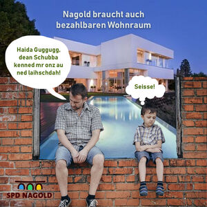 In Nagold gibt es keinen Wohnraum oder zumindest keinen zu bezahlbaren Preisen. Wohnen ist in Nagold die entscheidende soziale Frage. In Nagold entsteht ein Luxusbau nach dem anderen. Dies ist Ausdruck der hohen Attraktivität und hohen Lebensqualität in Nagold seit dem Innenstadtumbau. Dieser Wohnraum geht aber an den Bedürfnissen vieler Menschen vorbei. Aufgabe der Stadt ist es, dafür zu sorgen, dass Wohnen in Nagold wieder bezahlbar wird und vor allem bleibt. Wir brauchen mehr als quadratisch, teuer und luxuriös! Wir brauchen Wohnraum für Familien! Die SPD hat hierzu bereits verschiedene Vorschläge gemacht.